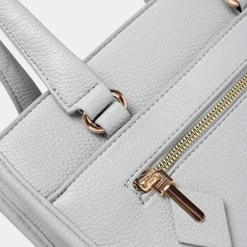 The Camifield Gray Boxy Handbag with Decorative Zipper is crafted from faux leather and designed for everyday use. Measuring 26.5 cm in width, 27 cm in height, and 21 cm in depth, this small-sized bag does not fit A4 documents. It includes one main compartment and interior pockets for organized storage. The bag features a zipper closure, gold-colored fittings, and protective feet at the bottom. The detachable and adjustable strap allows it to be worn over the shoulder or carried by hand. Suitable for year-round use.