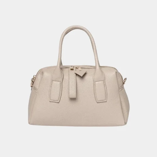 The Camifield Beige Shoulder Bag is crafted from faux leather and designed for everyday use. Measuring 30 cm in width, 18 cm in height, and 10 cm in depth, this medium-sized bag does not fit A4 documents. It includes two compartments and interior pockets for organized storage. The bag features a zipper closure, gold-colored fittings, and protective feet at the bottom. The detachable and adjustable strap allows it to be worn over the shoulder or carried by hand. Suitable for year-round use.