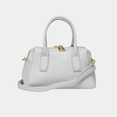 The Camifield Gray Shoulder Bag is crafted from faux leather and designed for everyday use. Measuring 30 cm in width, 18 cm in height, and 10 cm in depth, this medium-sized bag does not fit A4 documents. It includes two compartments and interior pockets for organized storage. The bag features a zipper closure, gold-colored fittings, and protective feet at the bottom. The detachable and adjustable strap allows it to be worn over the shoulder or carried by hand. Suitable for year-round use.